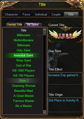 Weekly top 3 players on some ranking lists will be rewarded “Title” with buff.