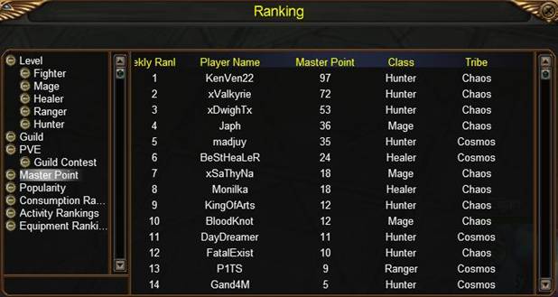 Ranking List is divided into four eight main categories: Level, Master Point, Guild, PVE, Popularity, Activity, Equipment Rate and Consumption rankings.