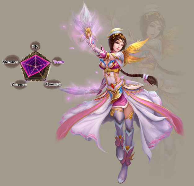 Every healer is a life-saving angel. They are unwilling to hurt others, but also don't want to see others are harmed. One day, Healers understood the truth from lute sounds, since then they use music to save others. Furthermore, Healers realized that only use music to help others is not enough. They also need more power to protect themselves and others. Finally, they did it and that double fans are their edge tool to kill enemies unknowingly.