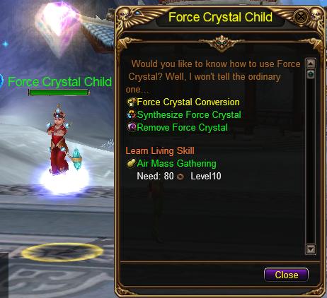 A level 20 and above level player can converse Force to Force Crystal by the help of NPC Force Crystal Child. The child is young but professional that he can converse Force to form a Force Crystal without any loss.
