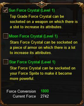 Force Crystal is another important usage of Force. Force Crystal can be socketed into weapon, defense gear and Force Sprite with slots to enhance their power. Force Crystal can be conversed from Force.