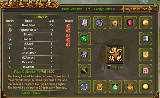 - On 14:00, Tuesday (server time/GMT-8), the top 5 players in the lucky list will be awarded and the lucky list will be cleared. The rewards will be mailed to the top 5 players in lucky list automatically.